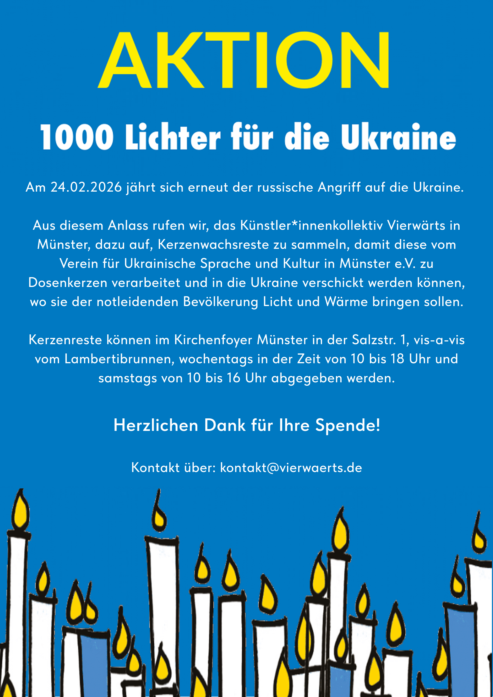 Auch in diesem Jahr haben wir mit der Aktion „1000 Lichter für die Ukraine“ dazu aufgerufen, Kerzenreste zu sammeln, damit diese in der „Kerzengießerei“ des Vereins Ukrainische Sprache und Kultur e.V. als Dosenkerzen verschmolzen in die Ukraine verschickt werden können, wo diese als Licht- und Wärmequelle wertvolle Überlebenshilfe leisten.