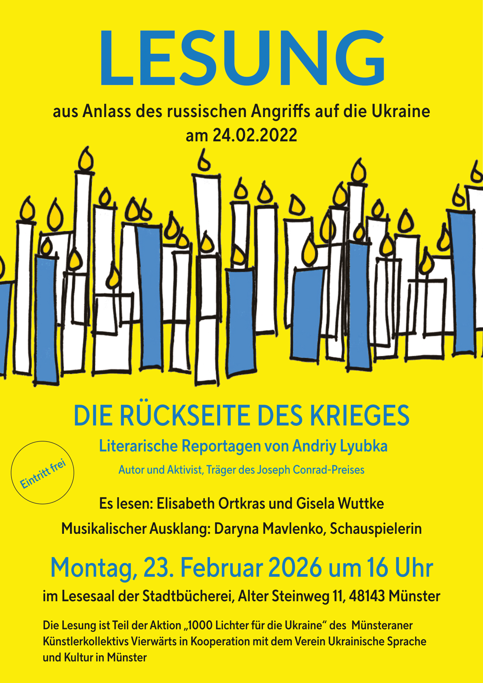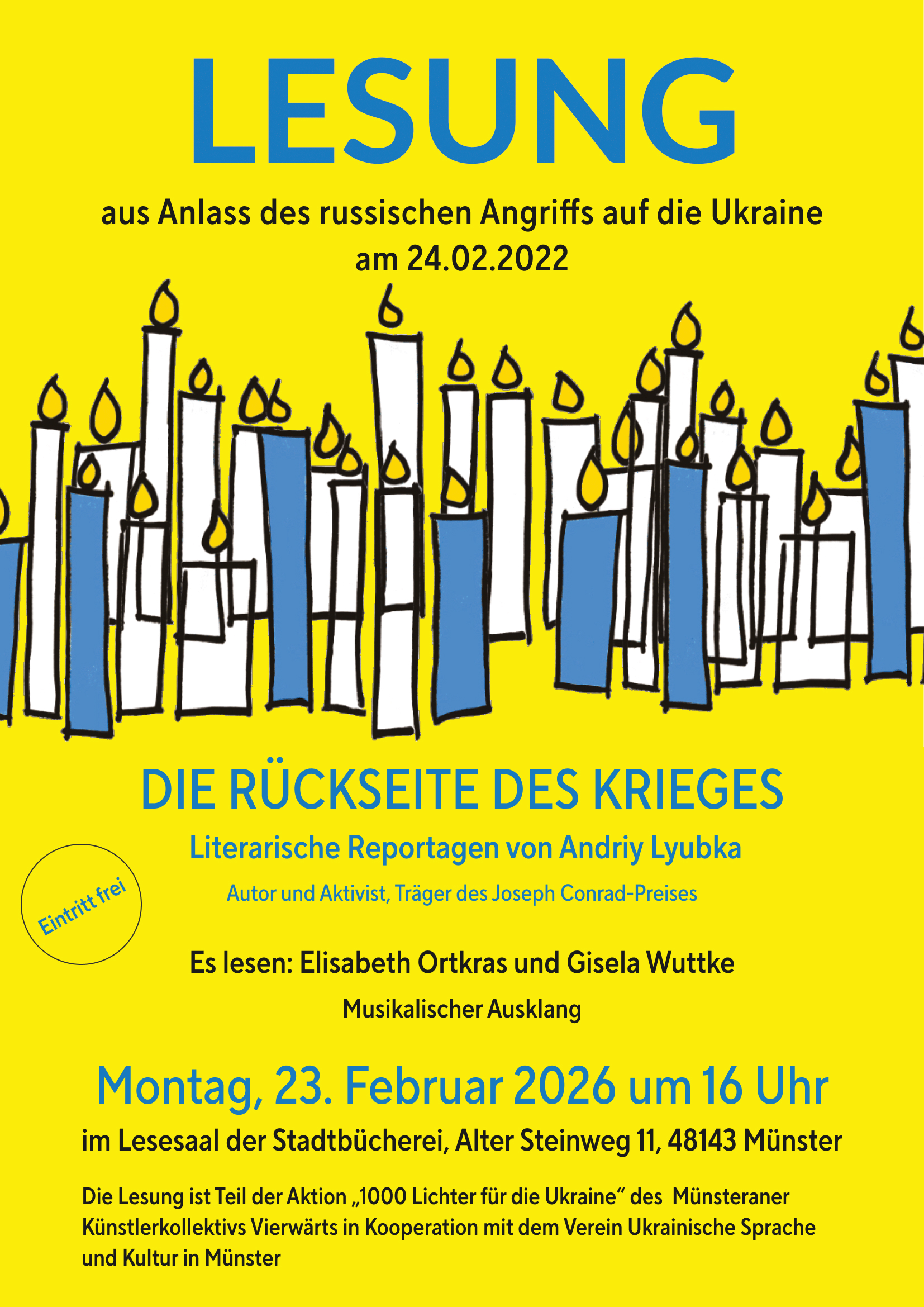 Gegen Ende des Jahres 2023 schien Gewissheit zu werden, dass allem Hoffen und Wünschen zum Trotz der großflächige Angriffskrieg auf die Ukraine ein zweites Jahr andauern würde. Zeit also, sich Gedanken darüber zu machen, welches Zeichen wir am 24.02.2024 setzen könnten, um an diesen Krieg im Herzen Europas zu erinnern.